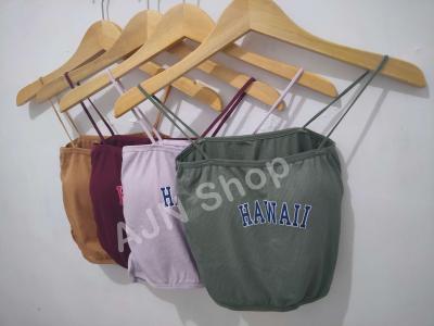 Motif sablon tulisan "Hawaii" dengan tali kecil, sudah ada busa cup bra yaa dan sudah terjahit (tidak bisa dilepas).